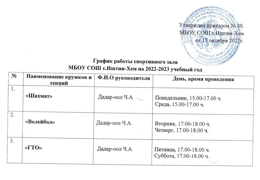 График работы спортивного зала МБОУ СОШ с. Иштии-Хем на 2022-2023 учебный год